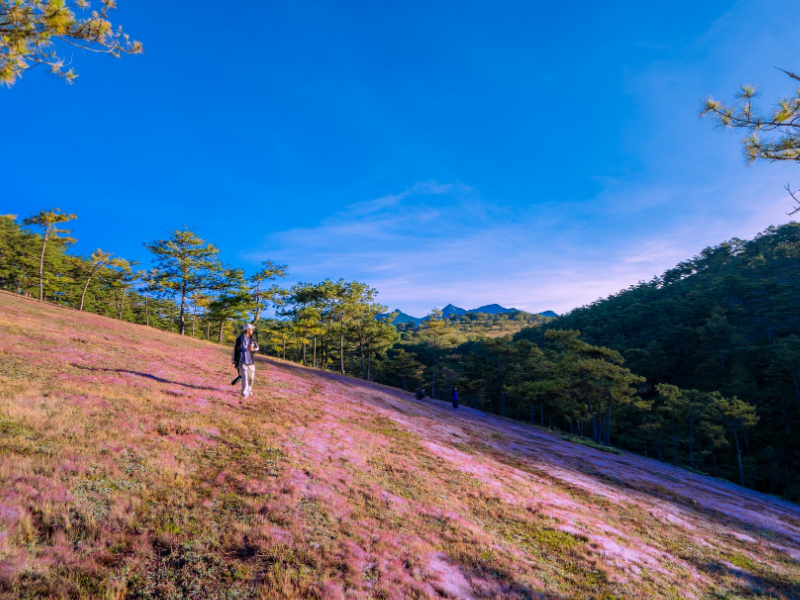 Tháng 11 là mùa của cỏ hồng loài cỏ chỉ xuất hiện trong thời gian ngắn nhưng lại khiến nhiều du khách mê mẩn. Cỏ hồng thường mọc thành từng thảm lớn, chuyển màu hồng phớt khi có sương sớm hoặc ánh nắng nhẹ.