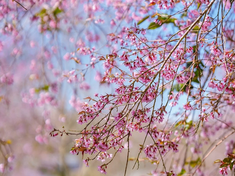 Tháng 1 được xem là thời điểm mở màn rực rỡ nhất cho hành trình mùa hoa Đà Lạt. Khi tiết trời se lạnh của những ngày đầu năm hòa cùng nắng xuân dịu nhẹ, hoa mai anh đào bắt đầu bung nở khắp các con đường, sườn đồi và khu dân cư. Sắc hồng phấn đặc trưng của mai anh đào phủ lên thành phố một vẻ đẹp vừa lãng mạn vừa tinh khôi, khiến Đà Lạt như khoác lên mình tấm áo xuân tươi mới.