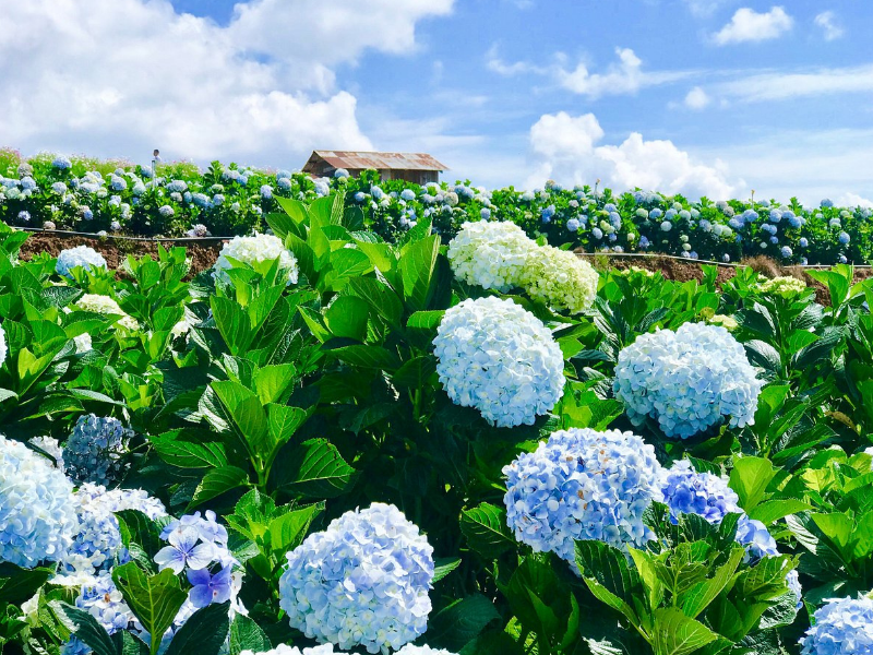 Tháng 7 và tháng 8 được xem là mùa hoa cẩm tú cầu đẹp nhất trong năm tại Đà Lạt. Những bông hoa to tròn với nhiều sắc độ từ xanh, tím, hồng đến trắng tạo nên khung cảnh vô cùng ấn tượng.