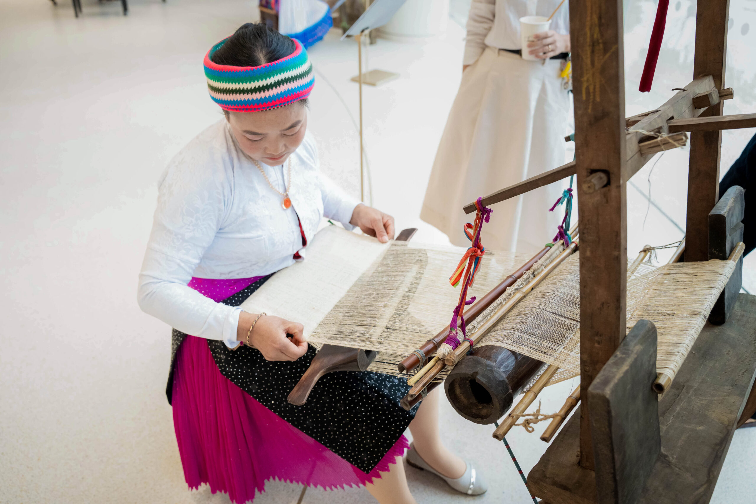 Bà con dân tộc H’Mông của xã Sán Sẻo Tý trực tiếp dệt vải tại sự kiện