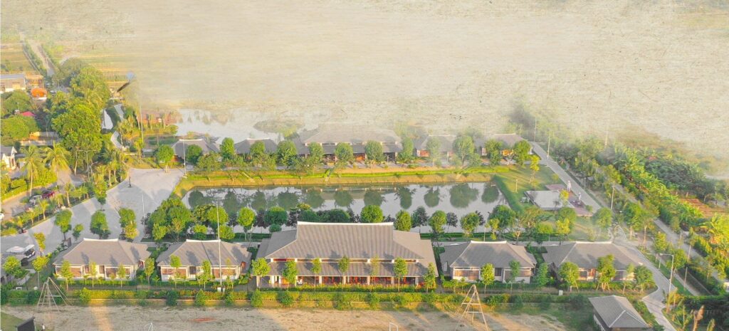 Khu du lịch được xây dựng dựa trên mô hình làng cổ, kết hợp giữa không gian truyền thống và tiện ích hiện đại. Những nếp nhà ngói đỏ, hàng cau xanh rợp bóng cùng ao sen, giếng nước gợi lên hình ảnh làng quê Việt xưa mộc mạc, gần gũi. Chính sự hòa quyện giữa nét cổ kính và tinh thần hiếu khách đã giúp nơi đây trở thành điểm đến “check-in” lý tưởng của du khách gần xa.