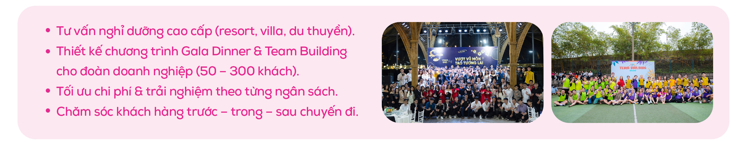 Mỗi chương trình được triển khai là một dấu ấn riêng, gắn liền với những yêu cầu và kỳ vọng khác nhau từ khách hàng. Những hình ảnh dưới đây không chỉ phản ánh quá trình thực hiện, mà còn thể hiện sự linh hoạt, chỉn chu và khả năng đồng hành của Ms. Phạm Thị Lượng trong từng hành trình.