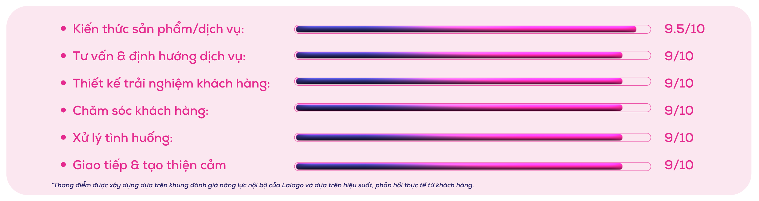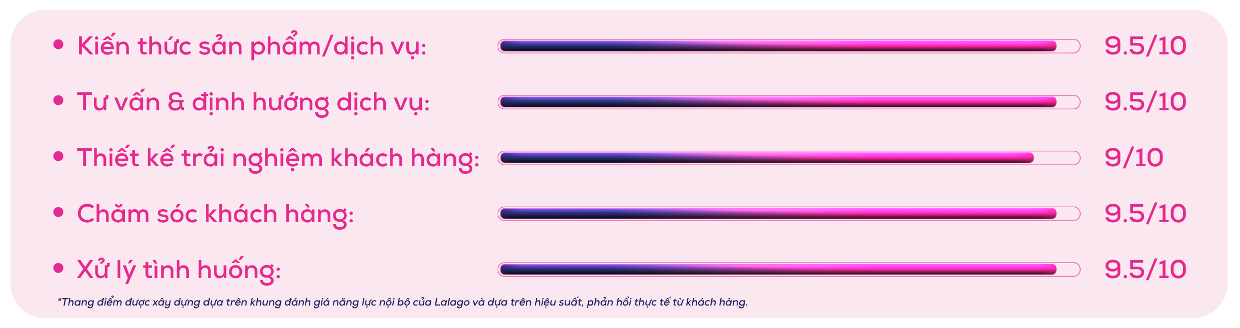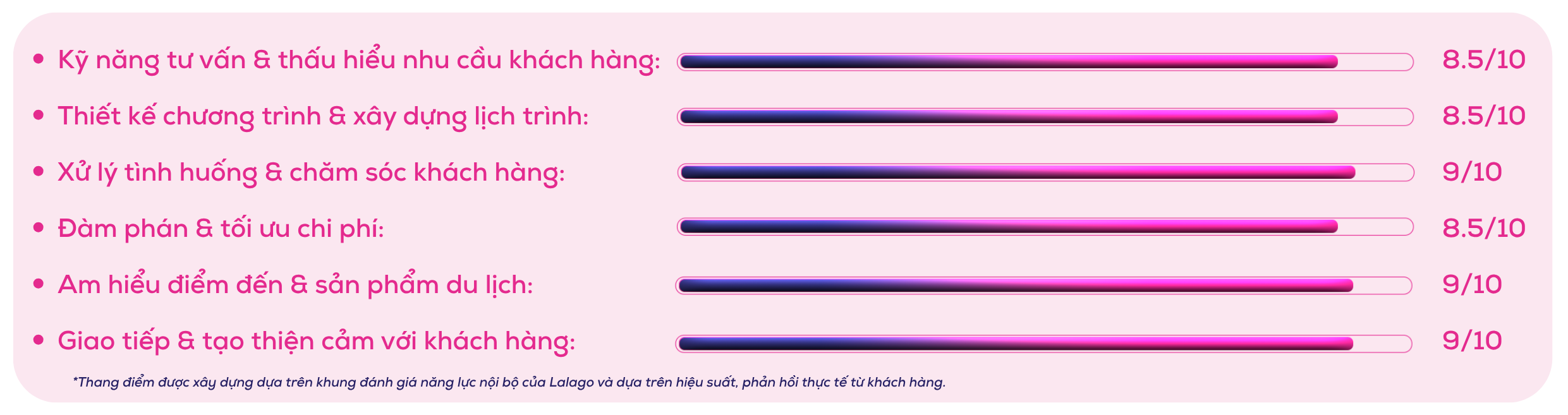 Các kỹ năng của Ms. Nguyễn Thị Ánh Xuân được đánh giá dựa trên hiệu quả làm việc thực tế, phản hồi từ khách hàng và ghi nhận nội bộ, góp phần đảm bảo chất lượng tư vấn và trải nghiệm trong từng hành trình.
