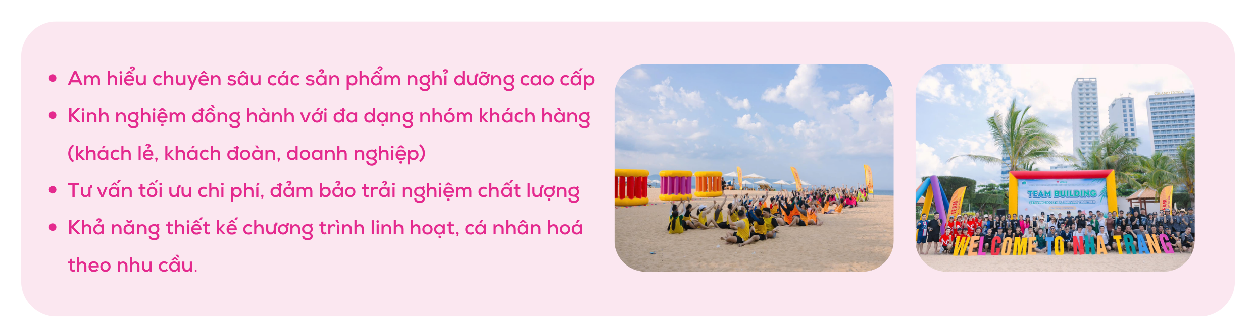 Ms. Trang tự tin tư vấn toàn diện cho khách hàng với nhiều loại hình dịch vụ như nghỉ dưỡng, gala dinner, team building, hội nghị – hội thảo… Bên cạnh đó, khả năng thấu hiểu nhu cầu và đặc điểm của khách cá nhân, đoàn doanh nghiệp và khách VIP giúp Ms. Trang luôn đưa ra những giải pháp tối ưu, đáp ứng chính xác mong đợi của từng khách hàng.