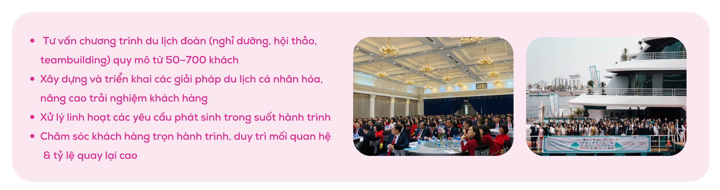 Với Ms. Phạm Lượng, mỗi chuyến đi là một hành trình được xây dựng từ sự thấu hiểu và linh hoạt trong từng chi tiết. Không chỉ dừng lại ở việc đáp ứng nhu cầu, chị luôn hướng tới việc mang lại trải nghiệm trọn vẹn và sự an tâm cho khách hàng trong suốt hành trình.